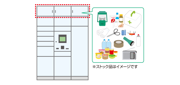 フルタイムロッカーの上部に災害時用備蓄品収納ボックス(ストックボックス)を導入。居住者共用の防災品を蓄えておくことができます。