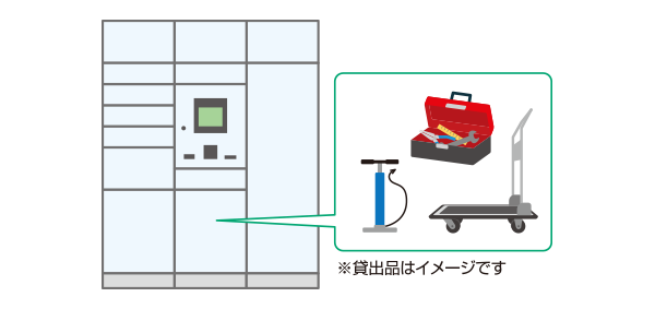 マンション居住者だけが利用できるよう操作キーで認証。カート・工具・空気入れなどのシェア(貸出返却)が手軽に実現します。