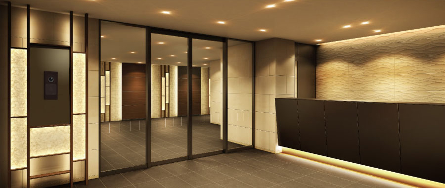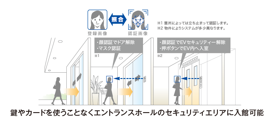 鍵やカードを使うことなくエントランスホールやエレベーターのセキュリティを解錠。荷物が多いときにも、ご年配の方やお子さまでも、ハンズフリーでスムーズに入館いただけます。
