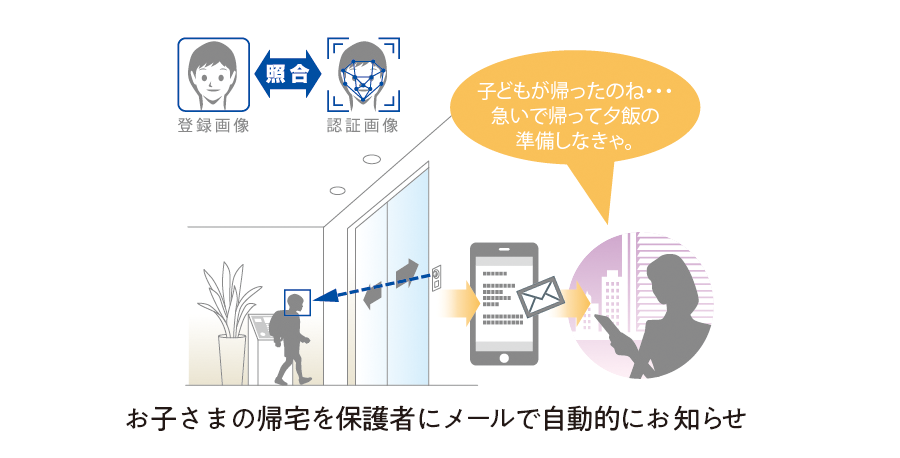顔認証登録しておくことで、お子さまが集合玄関を通過した際に、保護者の方に自動的にメールで帰宅をお知らせします。
