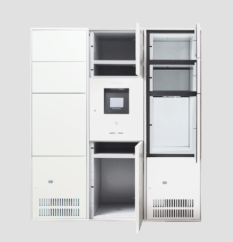 セキュリティの高いコンピュータ制御式の操作パネルと、頻繁に荷物が届く個人宅にも対応できる大容量設計で、集合住宅での安全で快適な荷物の受け渡しを実現する、冷蔵・冷凍機能付き宅配ボックス。