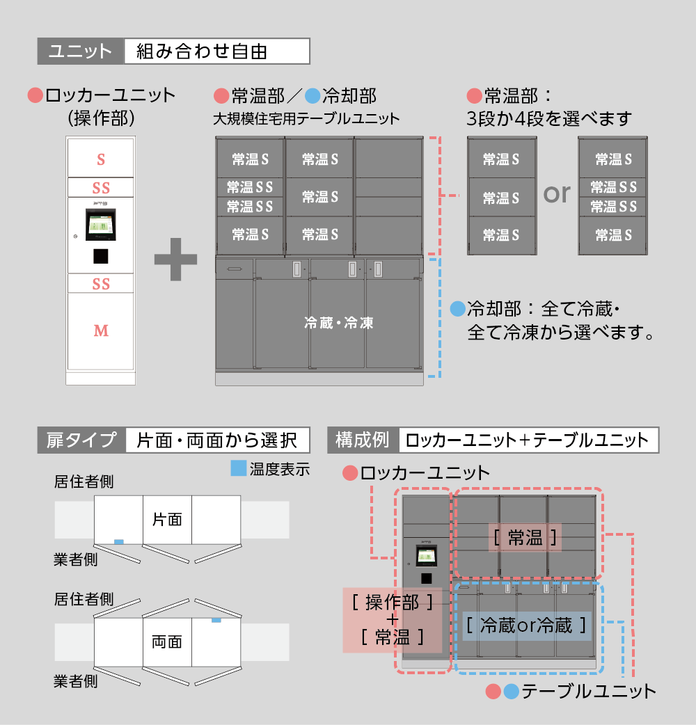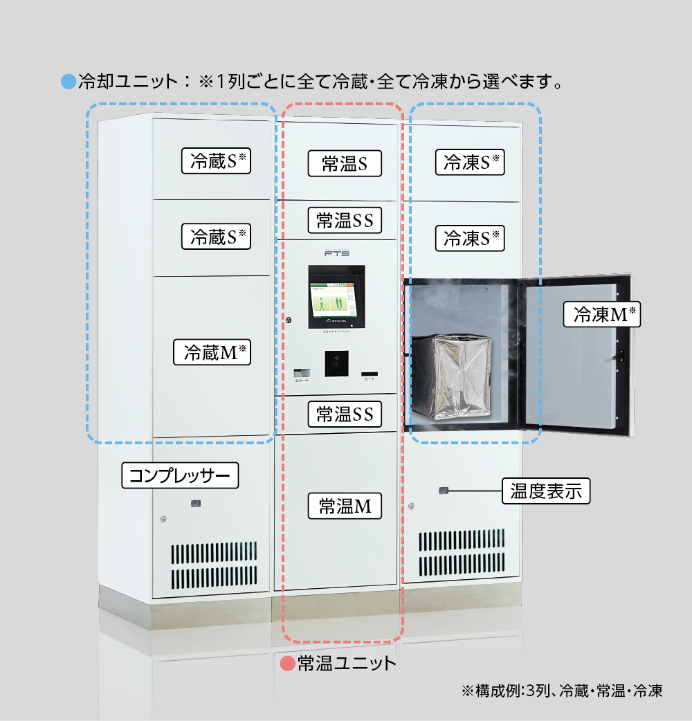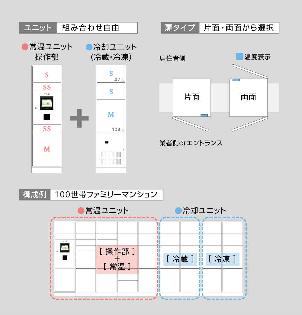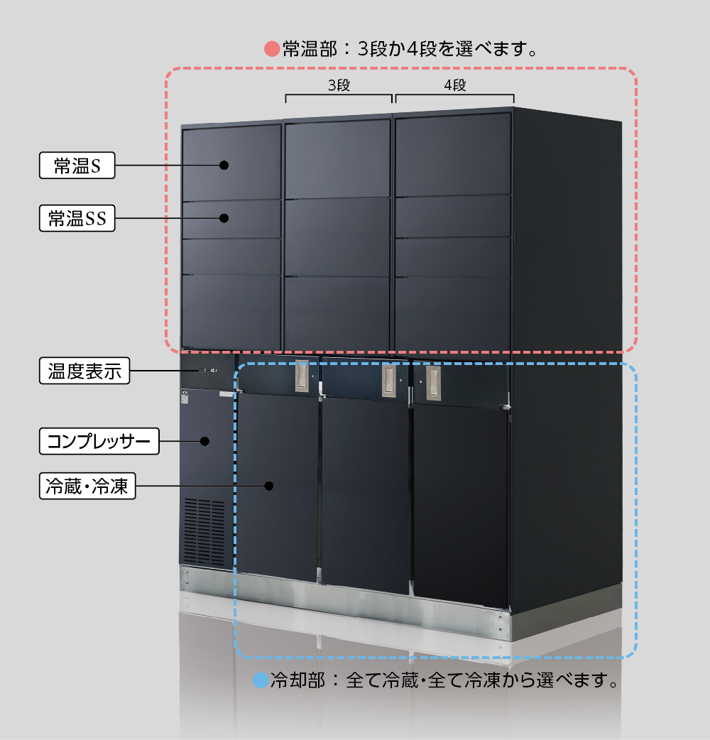 冷蔵・冷凍ボックスに加え、様々なサイズの常温ボックスが付いた大容量タイプ。どんな荷物でも受け取れる、ハイスペックな宅配ボックスです。