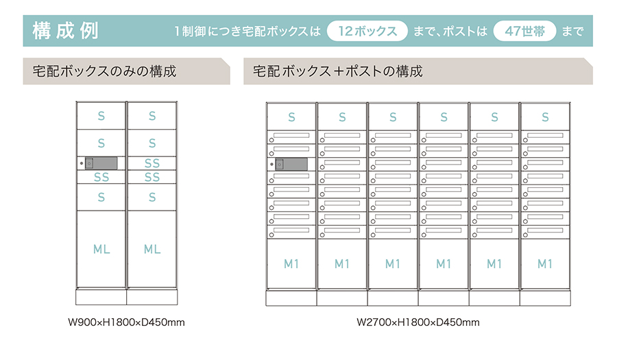 1制御につき、宅配ボックス:12ボックス、ポスト:47世帯まで対応